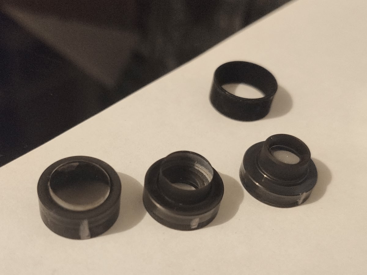 We can count 5 cells: 4 lens groups, 3 visibles on the next image (the top right one is a spacer). The first group is the front lens of the objective, still in the barrel.